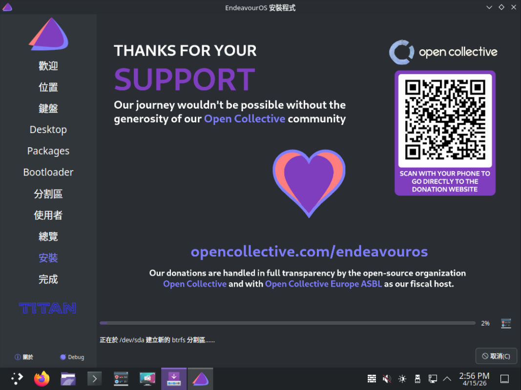 操作設備與作業系統 舊有主機 ( Windows 11 Home + EndeavourOS ) 作為開機 USB 製作設備 目標主機 ( Windows 11 Professional ) 即將操作安裝 EndeavourOS 雙作業系統 目標主機 Windows 版本資訊 版本 Windows 11 專業版 版本 24H2 OS 組建 26100.3323 體驗 Windows 功能體驗套件 1000.26100.54.0 系統類型 64 位元作業系統,x64 型處理器 安裝前準備 到 https://endeavouros.com/ 下載最新的 ISO 檔案,還有確保完整性與安全性的驗證檔案 EndeavourOS_Titan-2026.03.06.iso EndeavourOS_Titan-2026.03.06.iso.sha512 確保下載完整性 EndeavourOS_Titan-2026.03.06.iso.sig 確保來源是官方提供(安全性) 在舊有主機上製作開機 USB 我在舊有主機的 EndeavourOS 執行這個操作,但 Windows 也可以用 Rufus 做到。 信任官方 gpg key [user@eos ~]$ gpg --recv-key CDF595A1 gpg: key E3D8752ACDF595A1: public key "Johannes Kamprad (joekamprad development key) <joekamprad@endeavouros.com>" imported gpg: Total number processed: 1 gpg: imported: 1 [user@eos ~]$ gpg --edit-key CDF595A1 gpg (GnuPG) 2.4.9; Copyright (C) 2025 g10 Code GmbH This is free software: you are free to change and redistribute it. There is NO WARRANTY, to the extent permitted by law. pub rsa2048/E3D8752ACDF595A1 created: 2021-02-03 expires: never usage: SC trust: unknown validity: unknown sub rsa2048/9980FA8E52E66CA8 created: 2021-02-03 expires: never usage: E [ unknown] (1). Johannes Kamprad (joekamprad development key) <joekamprad@endeavouros.com> gpg> turst Invalid command (try "help") gpg> trust pub rsa2048/E3D8752ACDF595A1 created: 2021-02-03 expires: never usage: SC trust: unknown validity: unknown sub rsa2048/9980FA8E52E66CA8 created: 2021-02-03 expires: never usage: E [ unknown] (1). Johannes Kamprad (joekamprad development key) <joekamprad@endeavouros.com> Please decide how far you trust this user to correctly verify other users' keys (by looking at passports, checking fingerprints from different sources, etc.) 1 = I don't know or won't say 2 = I do NOT trust 3 = I trust marginally 4 = I trust fully 5 = I trust ultimately m = back to the main menu Your decision? 5 Do you really want to set this key to ultimate trust? (y/N) y pub rsa2048/E3D8752ACDF595A1 created: 2021-02-03 expires: never usage: SC trust: ultimate validity: unknown sub rsa2048/9980FA8E52E66CA8 created: 2021-02-03 expires: never usage: E [ unknown] (1). Johannes Kamprad (joekamprad development key) <joekamprad@endeavouros.com> Please note that the shown key validity is not necessarily correct unless you restart the program. gpg> quit [user@eos ~]$ 確保下載的 ISO 檔案由官方提供與下載完整。 ...